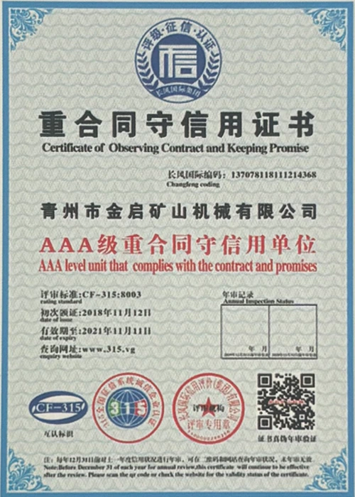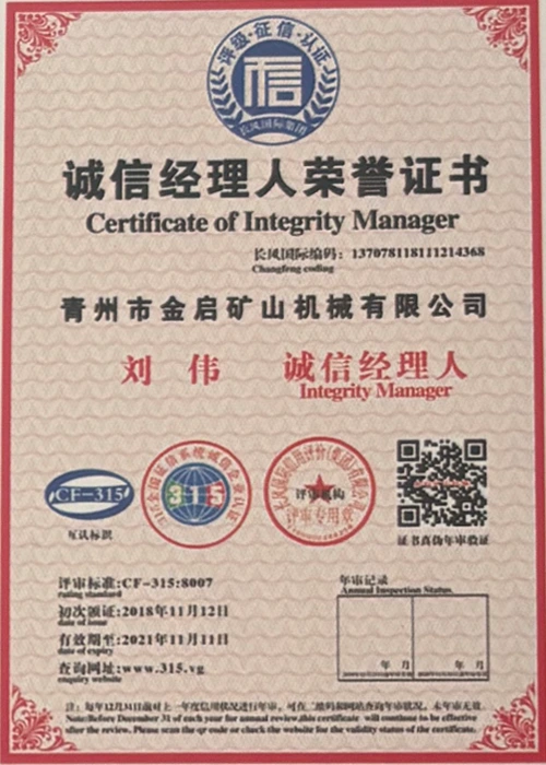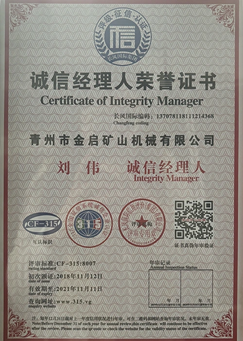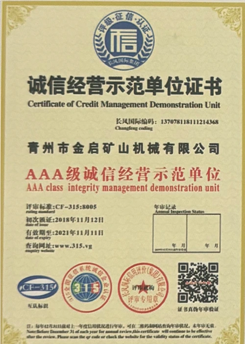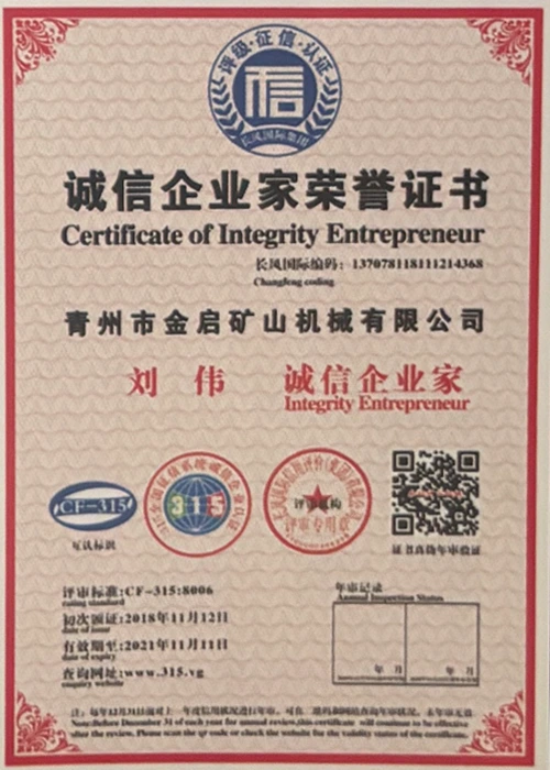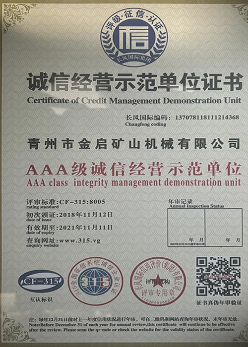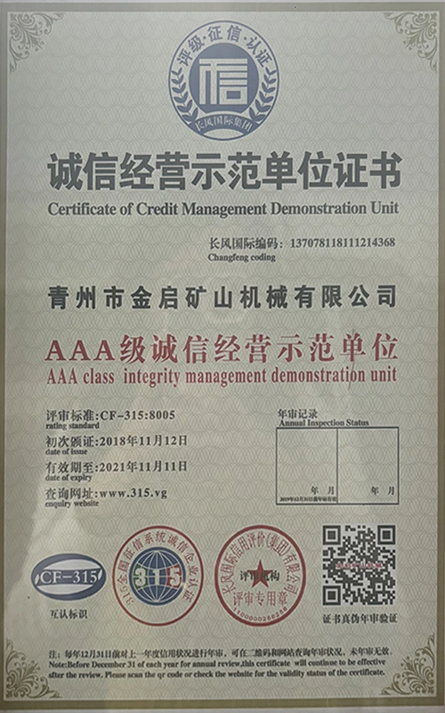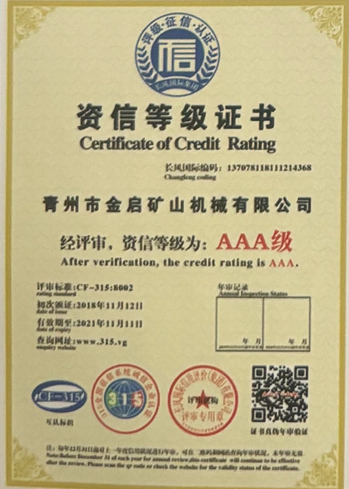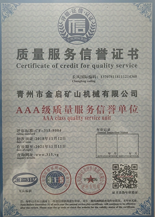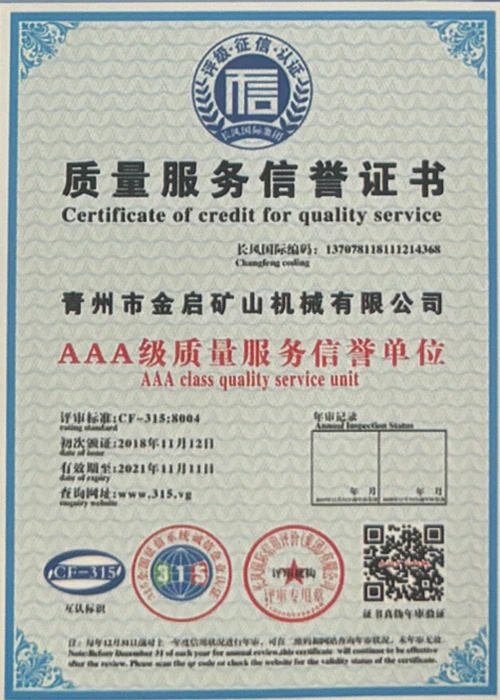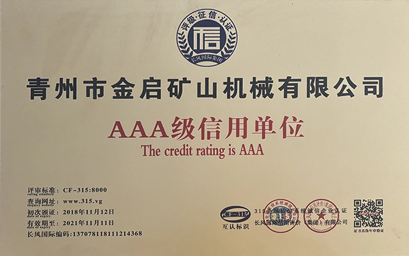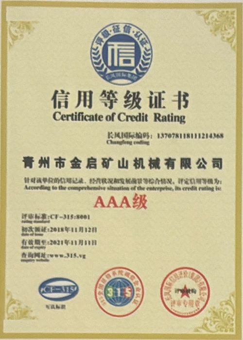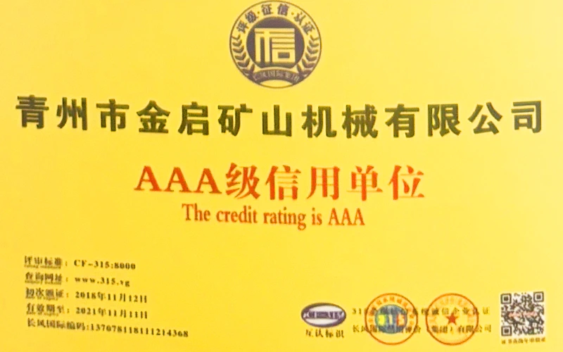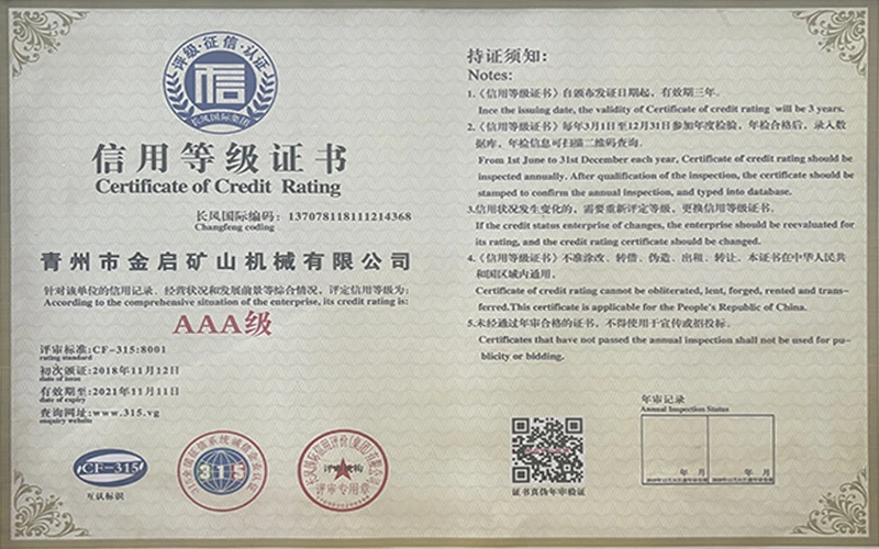 Me vite përvojë të thellë në industri, duke u mbështetur në kontrollin e rreptë të cilësisë dhe inovacionin e vazhdueshëm teknologjik, kompania ka marrë një sërë kualifikimesh, certifikimesh dhe certifikatash autoritative, duke përfshirë certifikimin e sistemit të menaxhimit të cilësisë ISO, certifikimin e sigurisë së produkteve minerare, si dhe patentat e shumta të shpikjeve dhe patentat e modeleve të dobishme, duke demonstruar fuqinë e pajisjeve dhe përmirësimin e teknologjisë për optimizimin e strukturës. garancia e prodhimit.